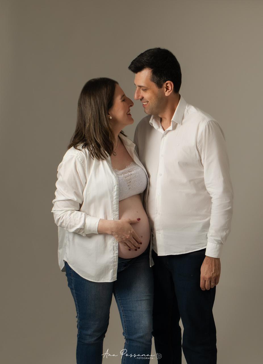 Entre as semanas 28 até no máximo 33 semanas de gestação. Lembre de agendar seu ensaio com pelo menos um mês de antecedência em relação a esse período.